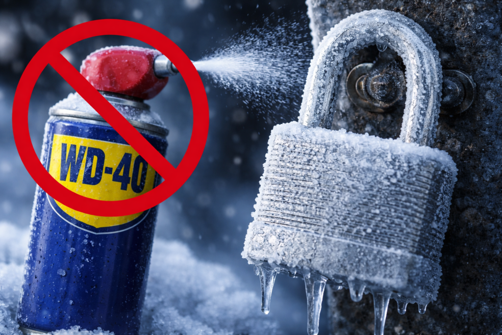 - What to Avoid: NEVER use WD-40, cooking oil, or hot water on a frozen lock.